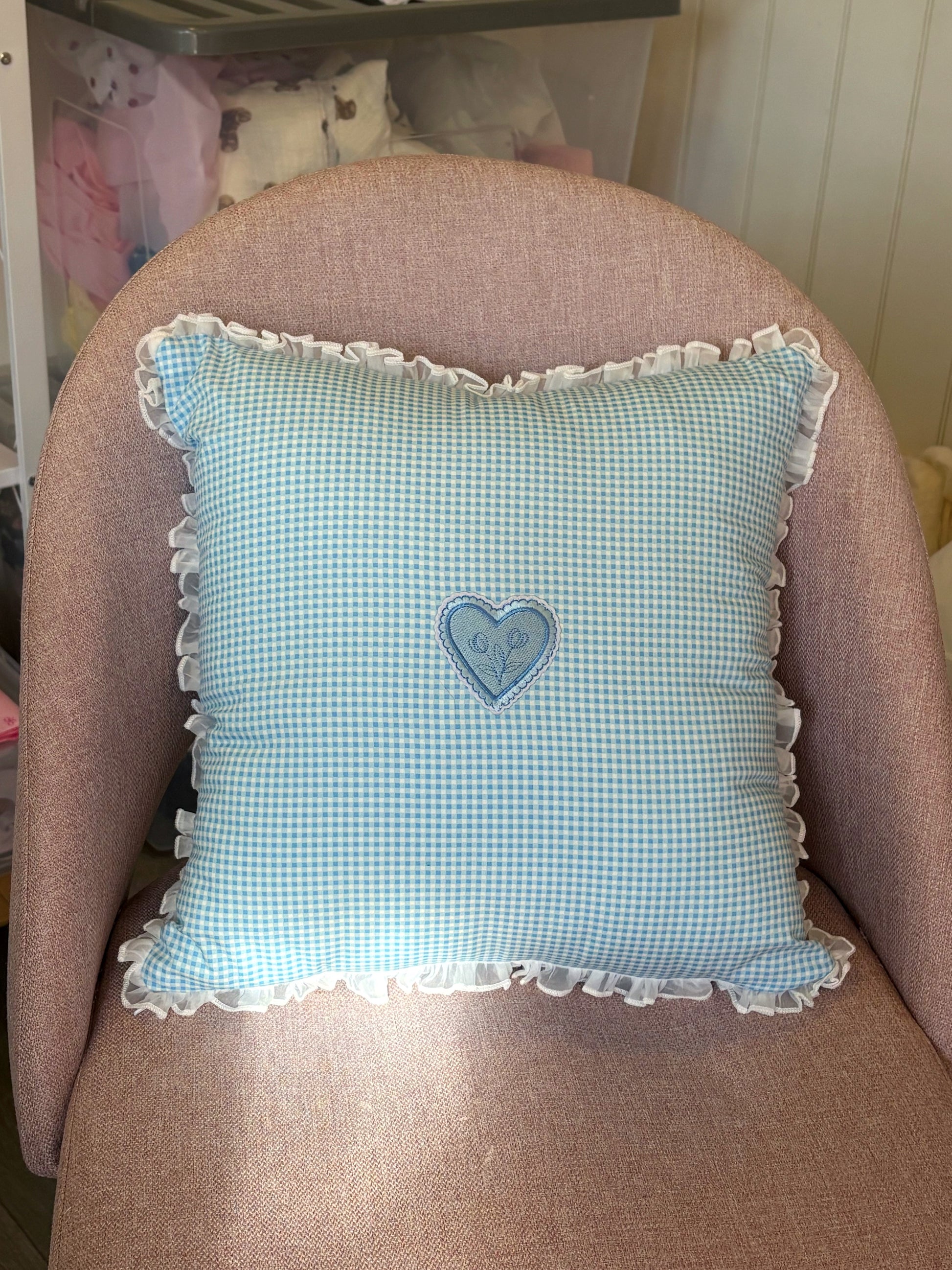 Blue gingham cushion with white chiffon ruffles, a zipper fastening so it is easy to wash, and appliqué heart. The perfect spring and summer accessory! 40cm x 40cm.