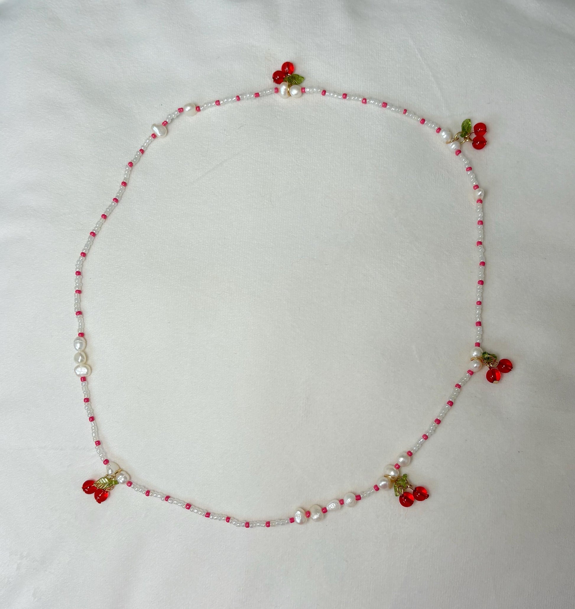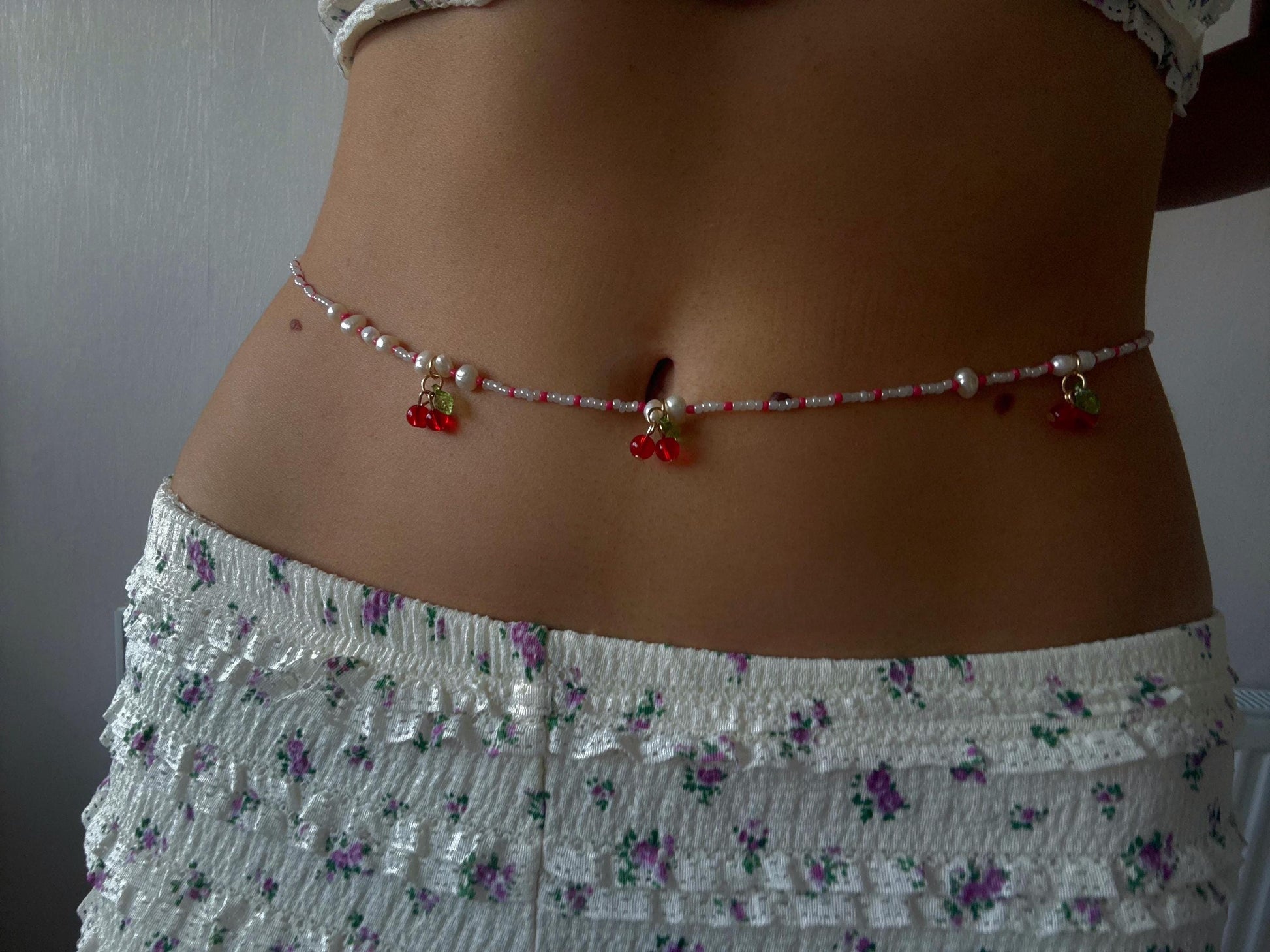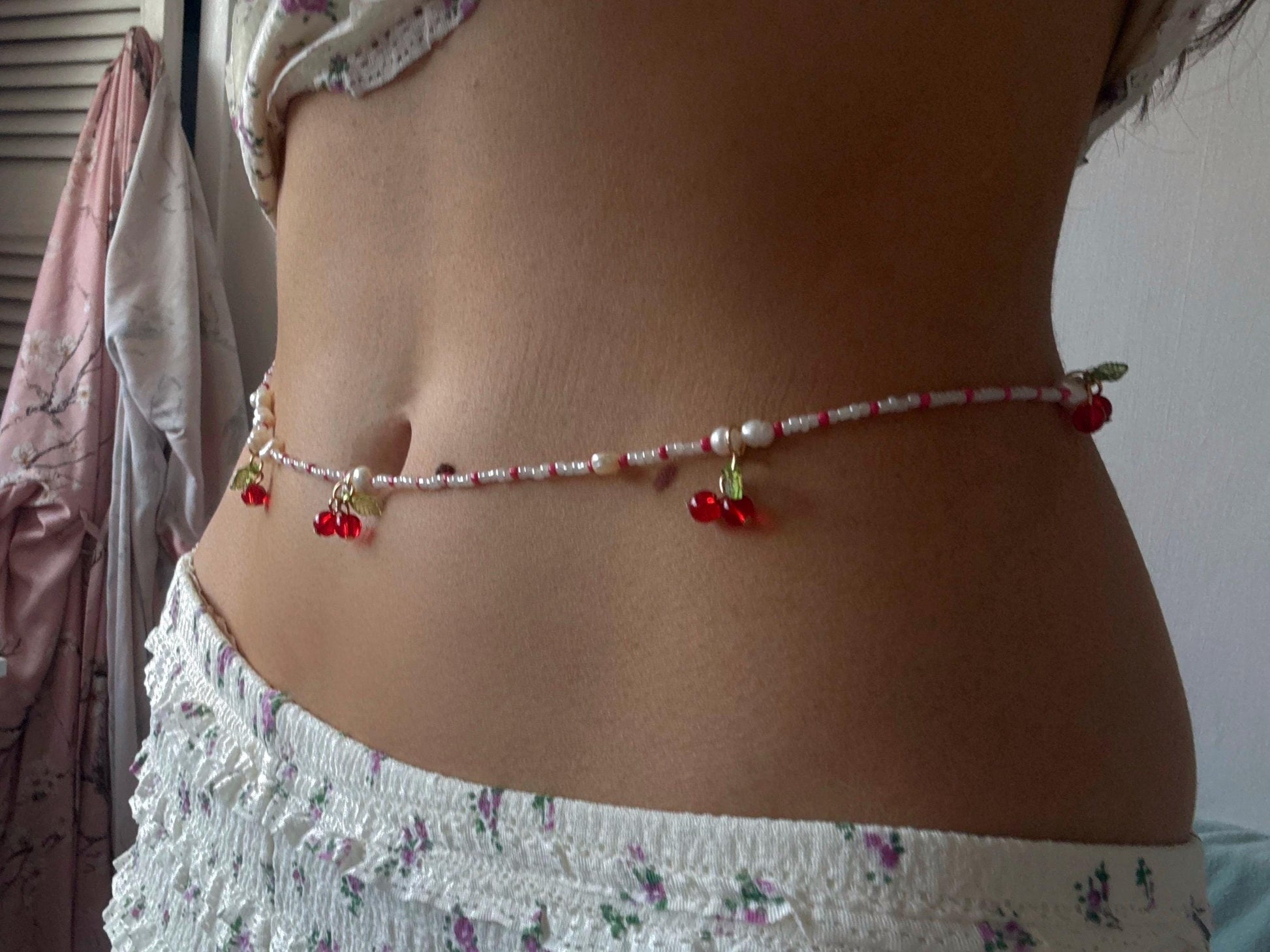 Cherry beaded waist beads with cherry charms, pearls and white and red beads. Elasticated fit.