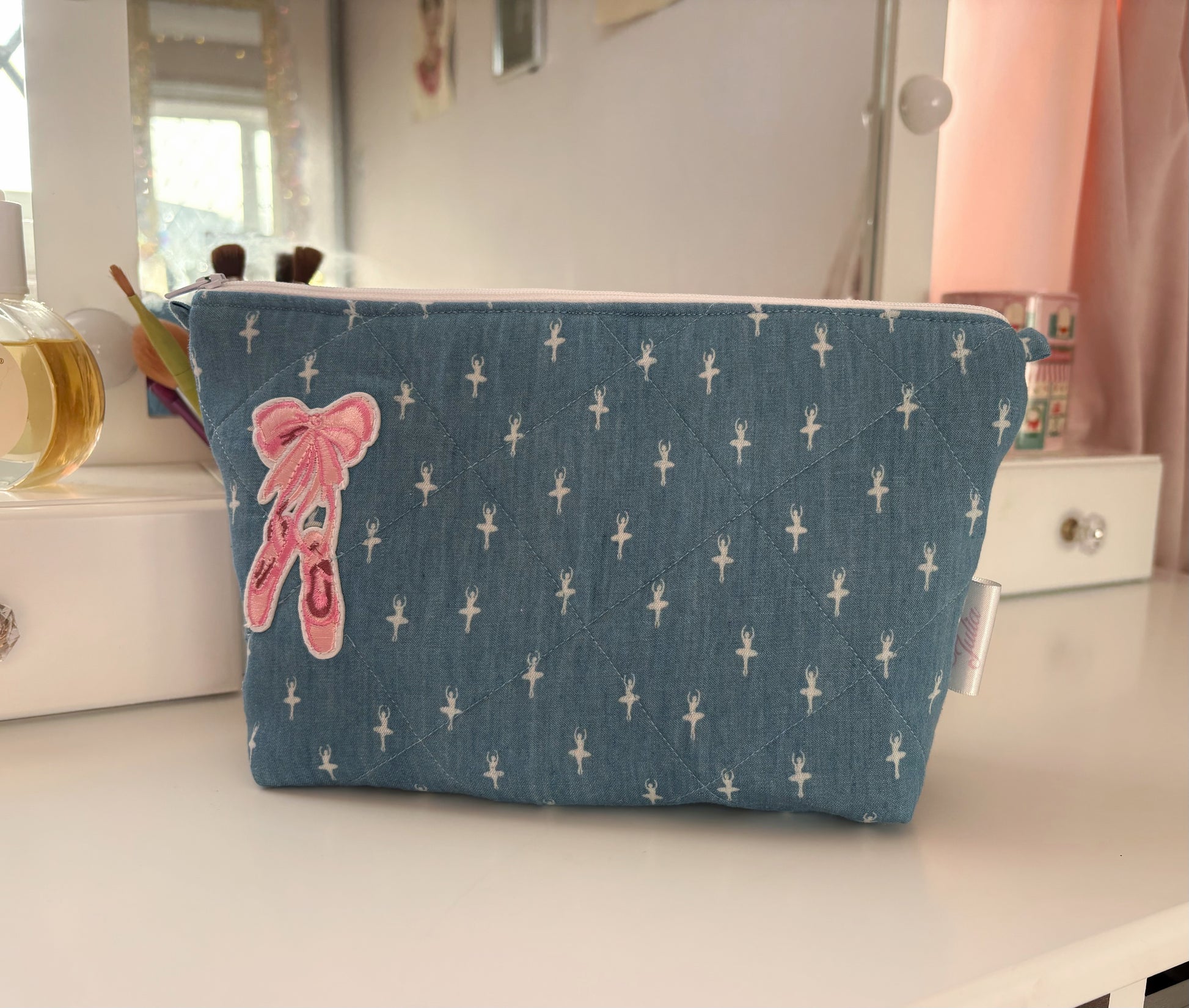 This quilted makeup bag comes in a blue denim fabric with a ballerina print, with a zipper fastening and ballet slipper appliqué. This is the perfect bag for travelling with makeup and cosmetics.