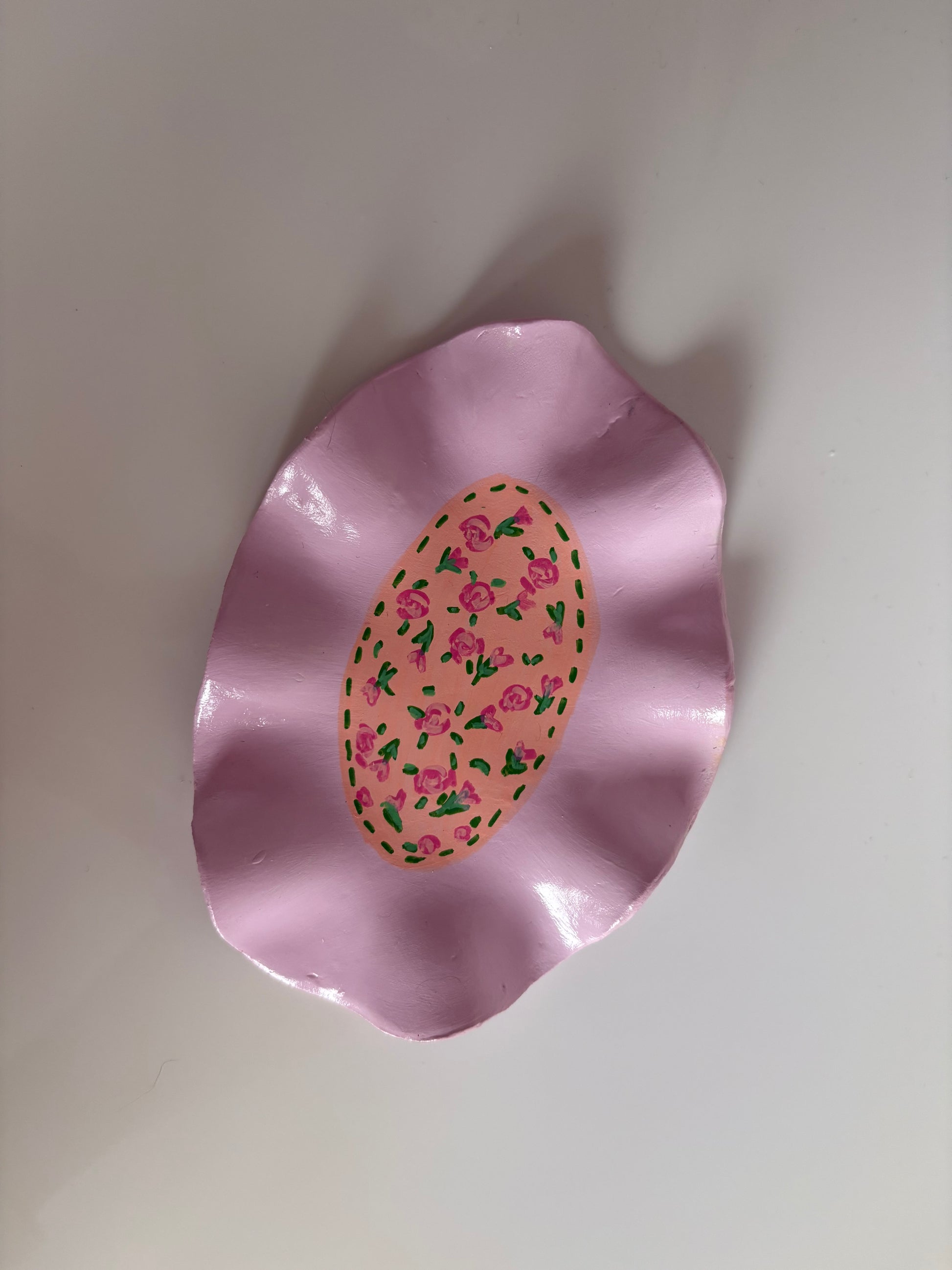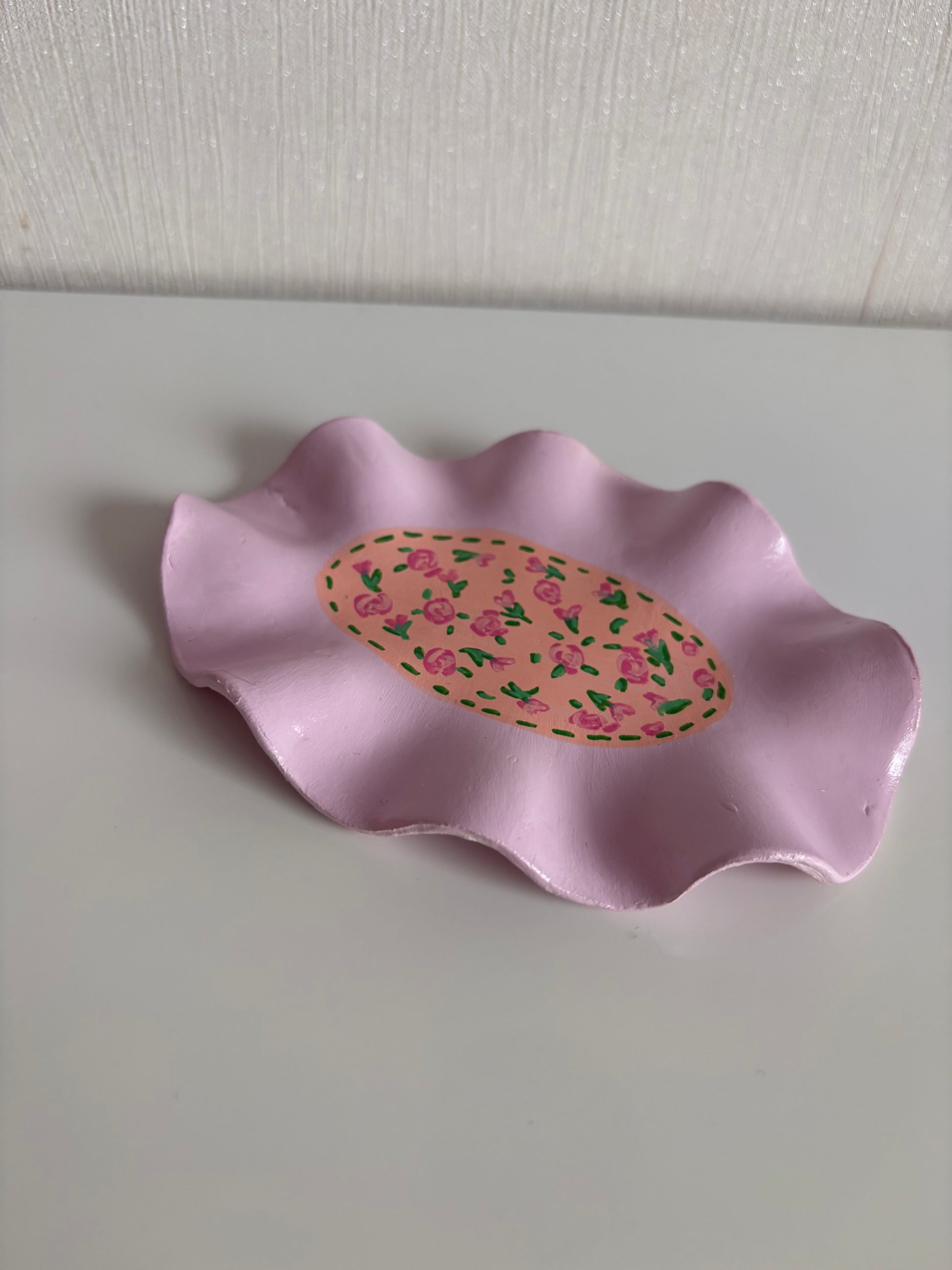 Handmade pink wavy jewellery trinket, with hand painted floral pattern details, made with air dry clay!
