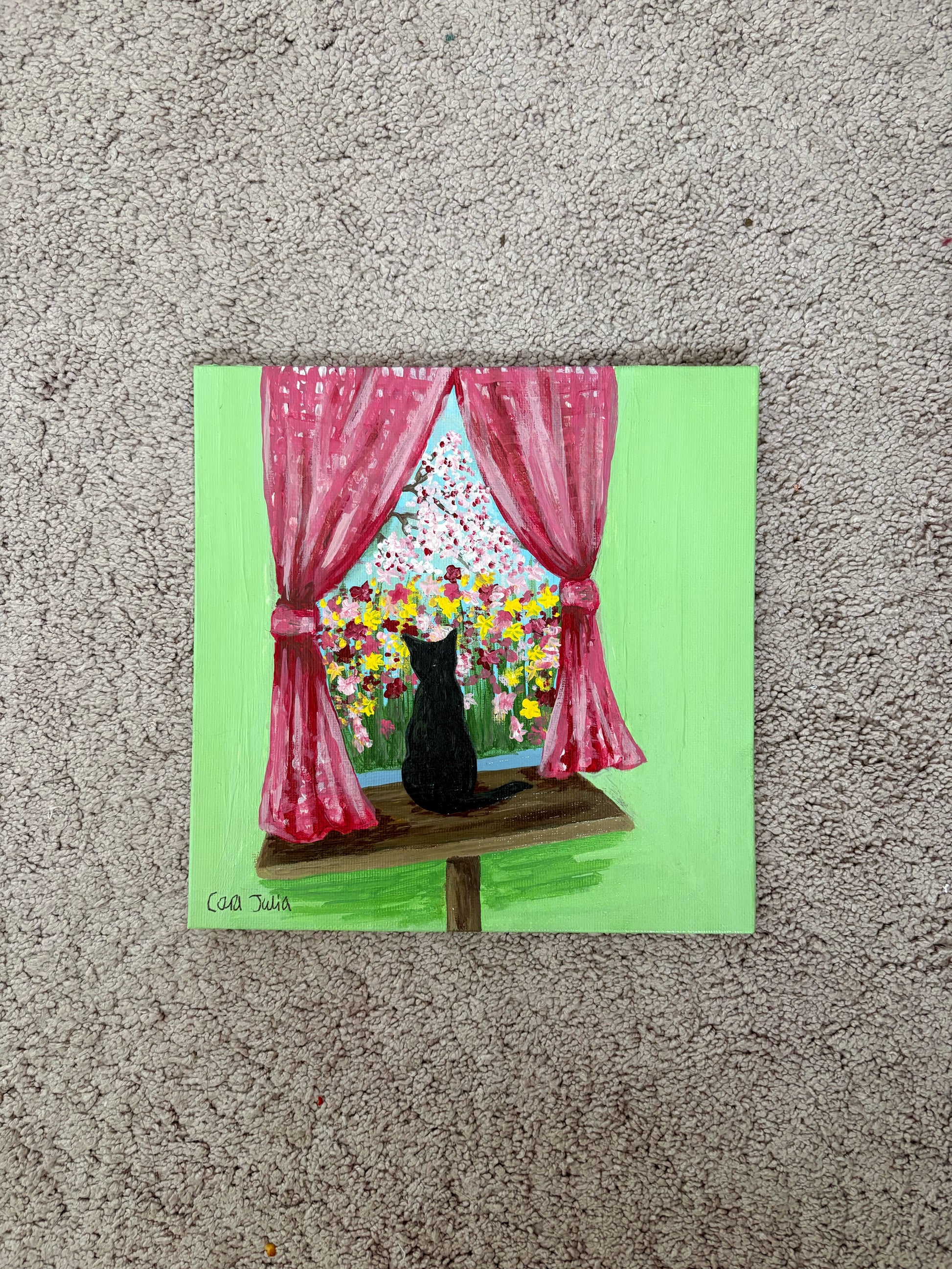 Original one of a kind painting of a black cat looking out the window at beautiful colourful flowers, acrylic on canvas. 20cm x 20cm.