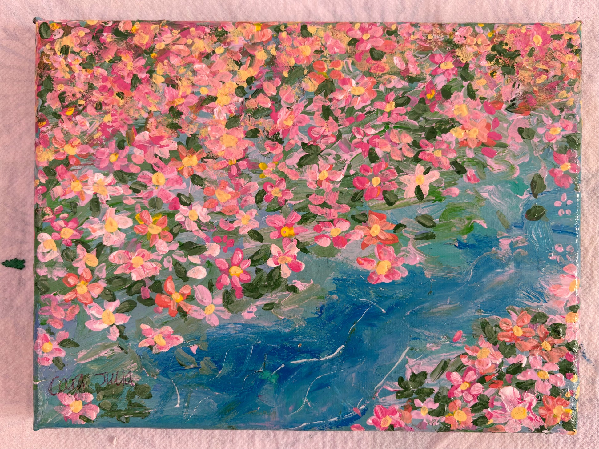 Hand painted flowers and lake using acrylic paint on canvas. 20 x 15cm.