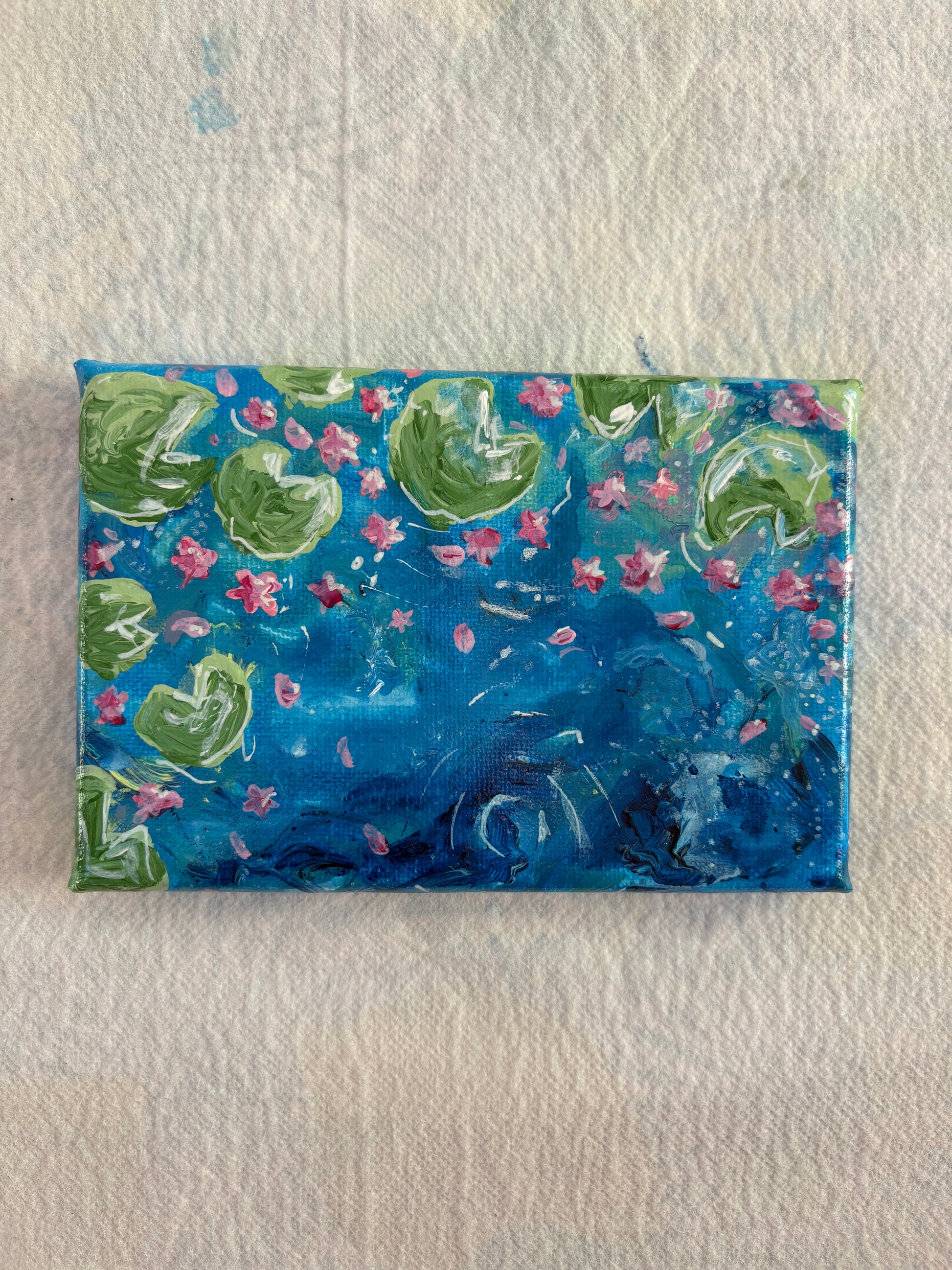 Hand painted water, lily pads and flowers using acrylic paint on canvas. 15 x 10cm.