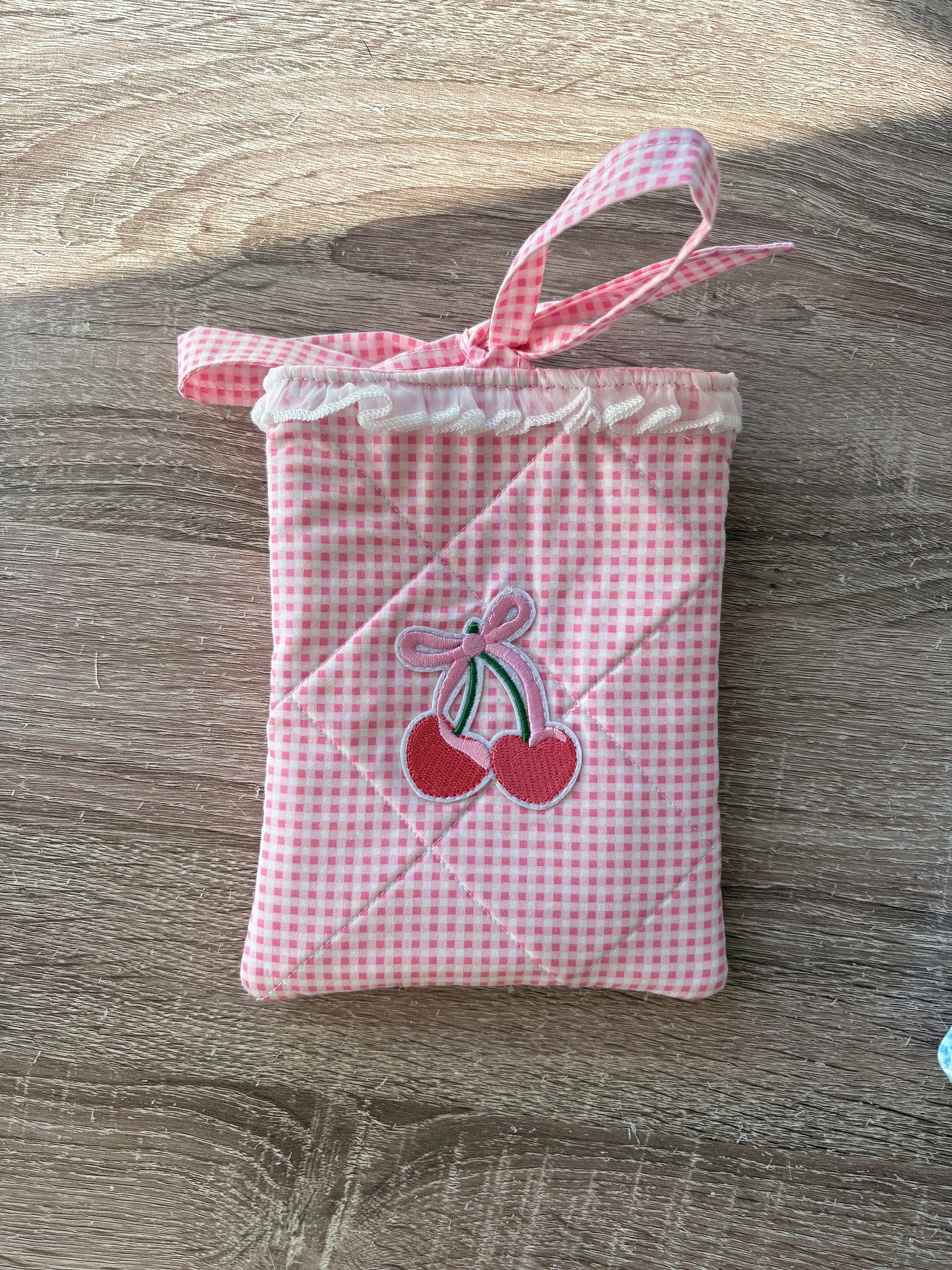 Pink and white gingham quilted kindle sleeve handmade with cherry appliqué