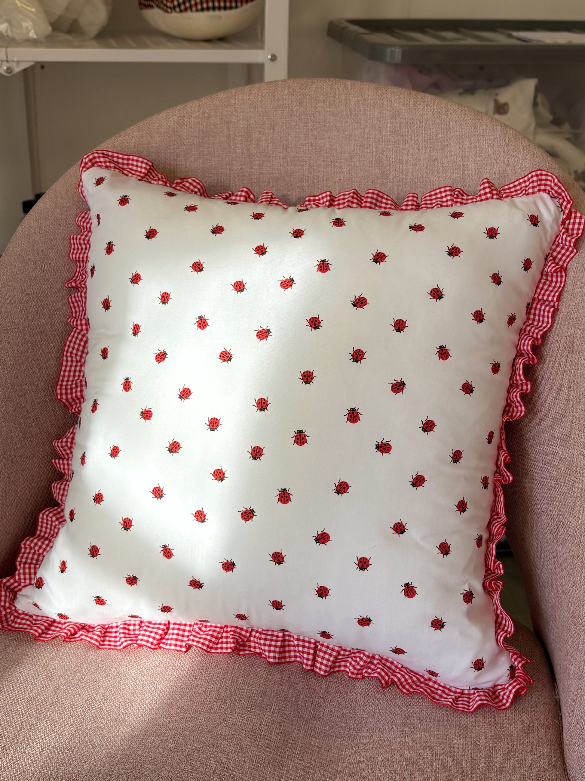Red and white ladybug cushion with red gingham ruffles and a zipper fastening so it is easy to wash. The perfect spring and summer accessory! 40cm x 40cm.