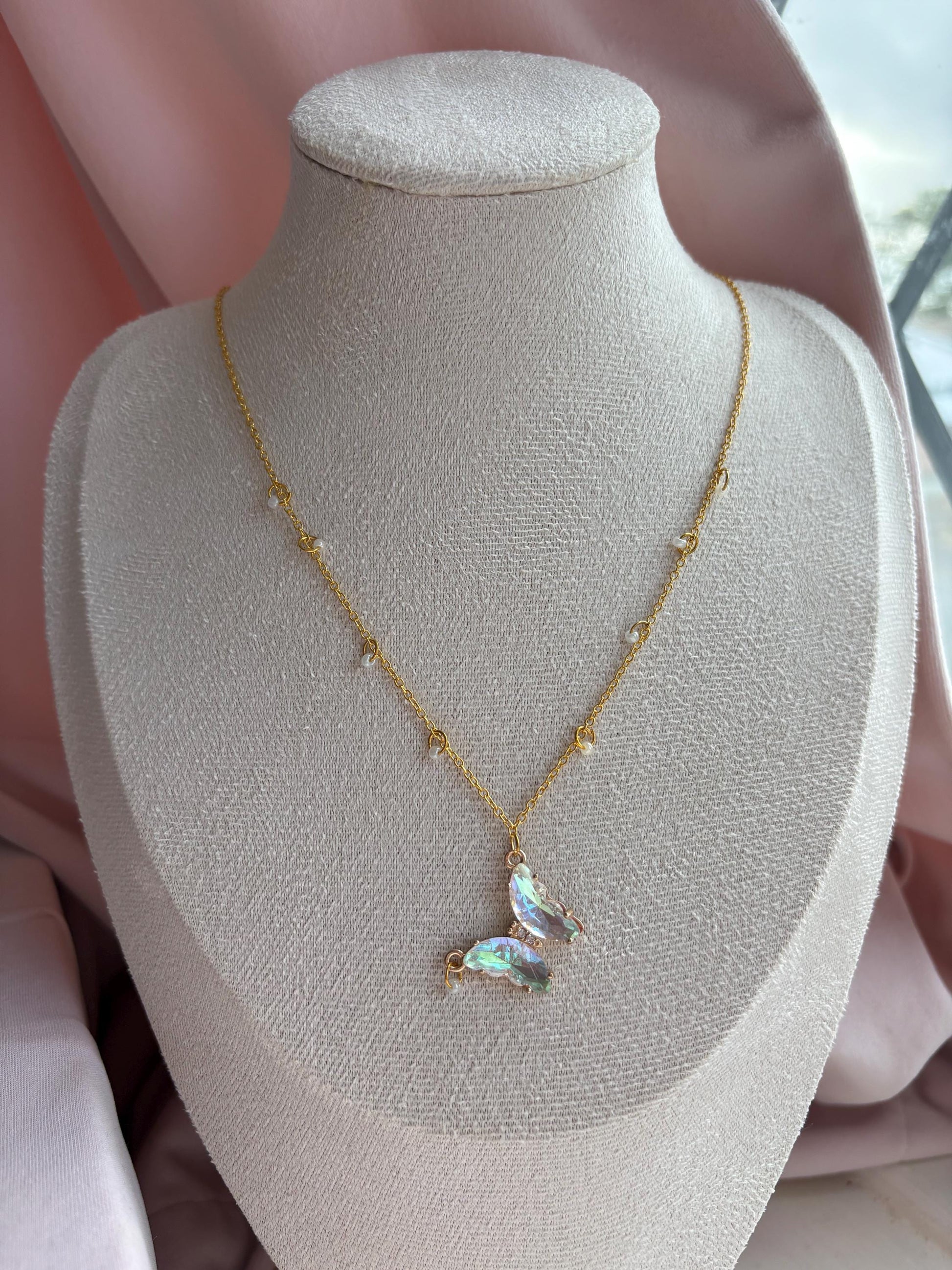 A dainty and cute crystal butterfly pendant necklace with matching white beads on a gold plated iron 18 inch chain. Perfect for a gift for a loved one or a pretty treat for yourself.